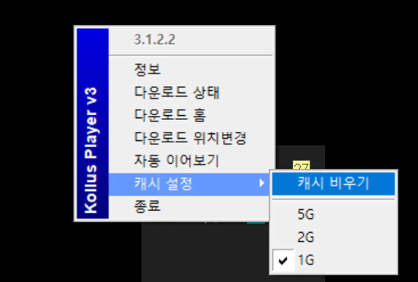 3. 바탕화면 작업표시줄 우측 하단-콜러스 플레이어 아이콘 위에서 마우스 오른쪽 클릭-콜러스 플레이어 캐시 비우기