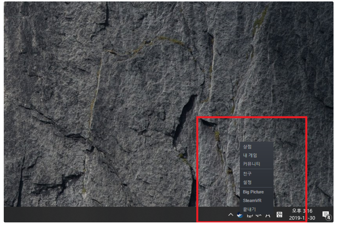[1] 작업표시줄 우측 하단에서 'Steam Client' 아이콘 우클릭-끝내기를 선택합니다. 확인이 어려우신 경우, ^ 클릭후 'Steam Client' 아이콘 우클릭-끝내기를 선택합니다.